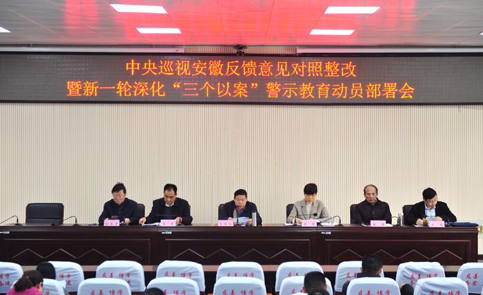 2021年3月5日上午,我院在逸夫楼二楼第二会议室召开中央巡视安徽反馈意见对照整改暨新一轮深化“三个以案”警示教育动员部署会,全体院领导和学院副处级以上领导干部参加会议,院党委书记汪刘送主持会议。