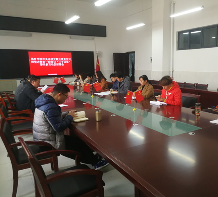 会议强调:针对中央巡视组巡视反馈意见,与会人员要坚持“实事求是、务求实效、突出重点、完善机制、长期坚持”的原则,结合新一轮深化“三个以案”警示教育活动举一反三,突出“四看四促”真正把自己摆进去,锲而不舍深化作风建设,以力求实效、群众满意为目标,深入推进体育学院党建和发展工作落实见效,以优异成绩庆祝建党100周年。