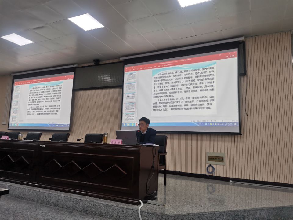 会上,校纪委副书记、纪委办公室主任张劲松从修订背景、内容变化和如何贯彻等三个方面,对《中国共产党纪律处分条例》进行了深入解读;他以《从日常监督看高校存在的突出问题》为题,从高校政治生态方面存在的突出问题、全面从严治党、党风廉政建设和反腐败方面存在的突出问题、原因分析、加强和改进高校政治生态的思考和建议、对“四种形态”指标的理解和把握等5个方面,结合具体事例和数据,对目前高校政治生态存在的问题进行了解读和通报。他指出,要对标对表、补缺补差,要以案为戒、以案促改,立足岗位实际,切实加强日常监督工作,着力营造正气充盈的良好政治生态。