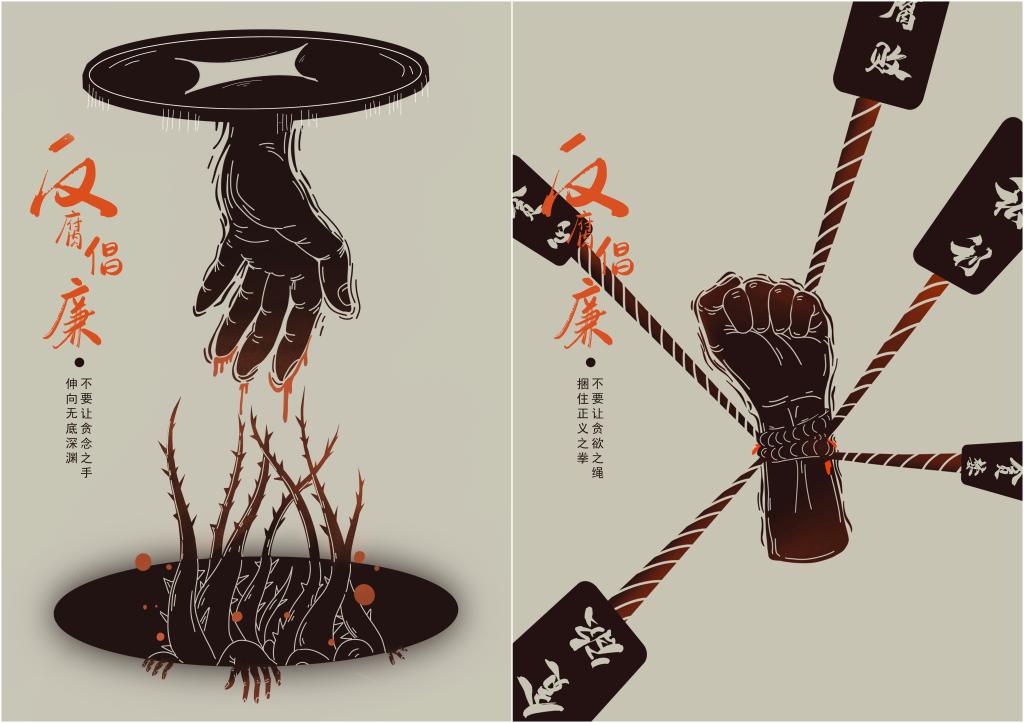 入选作品由美术与设计学院学生张钰创作,作品以手的形象为主题展开,以黑红灰为主色调,以“贪念之手”和“贪欲之绳”为反面典型警示,告诫人们时刻保持清醒,杜绝贪念,树立清正廉洁的品质。
