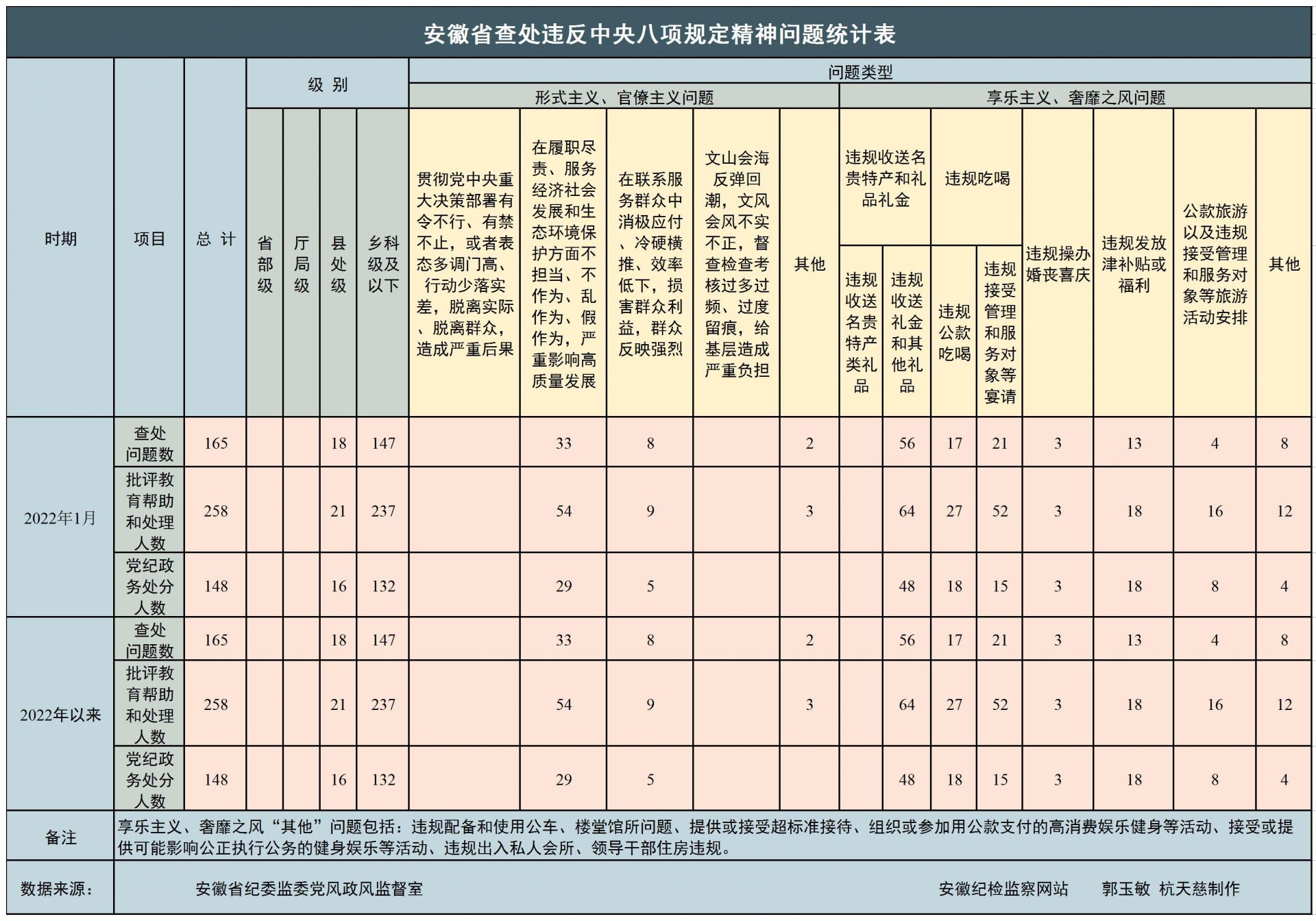 2022年1月,全省纪检监察机关共查处违反中央八项规定精神问题165起,批评教育帮助和处理258人,其中给予党纪政务处分148人,同比分别下降12.2%、上升4.5%、9.6%。