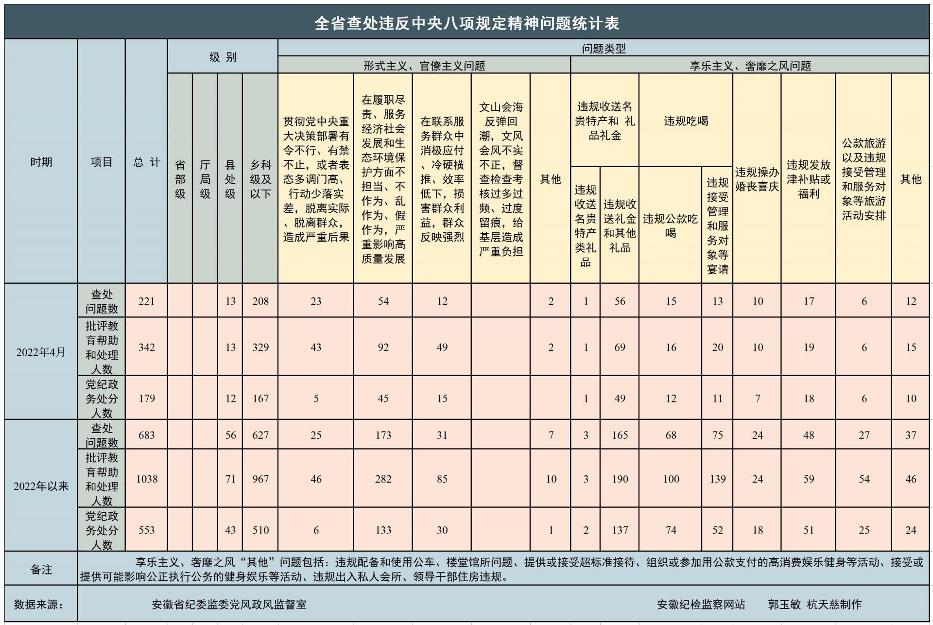 2022年4月,全省纪检监察机关共查处违反中央八项规定精神问题221起,批评教育帮助和处理342人,其中给予党纪政务处分179人,同比分别下降10.9%、5.3%、上升4.7%。