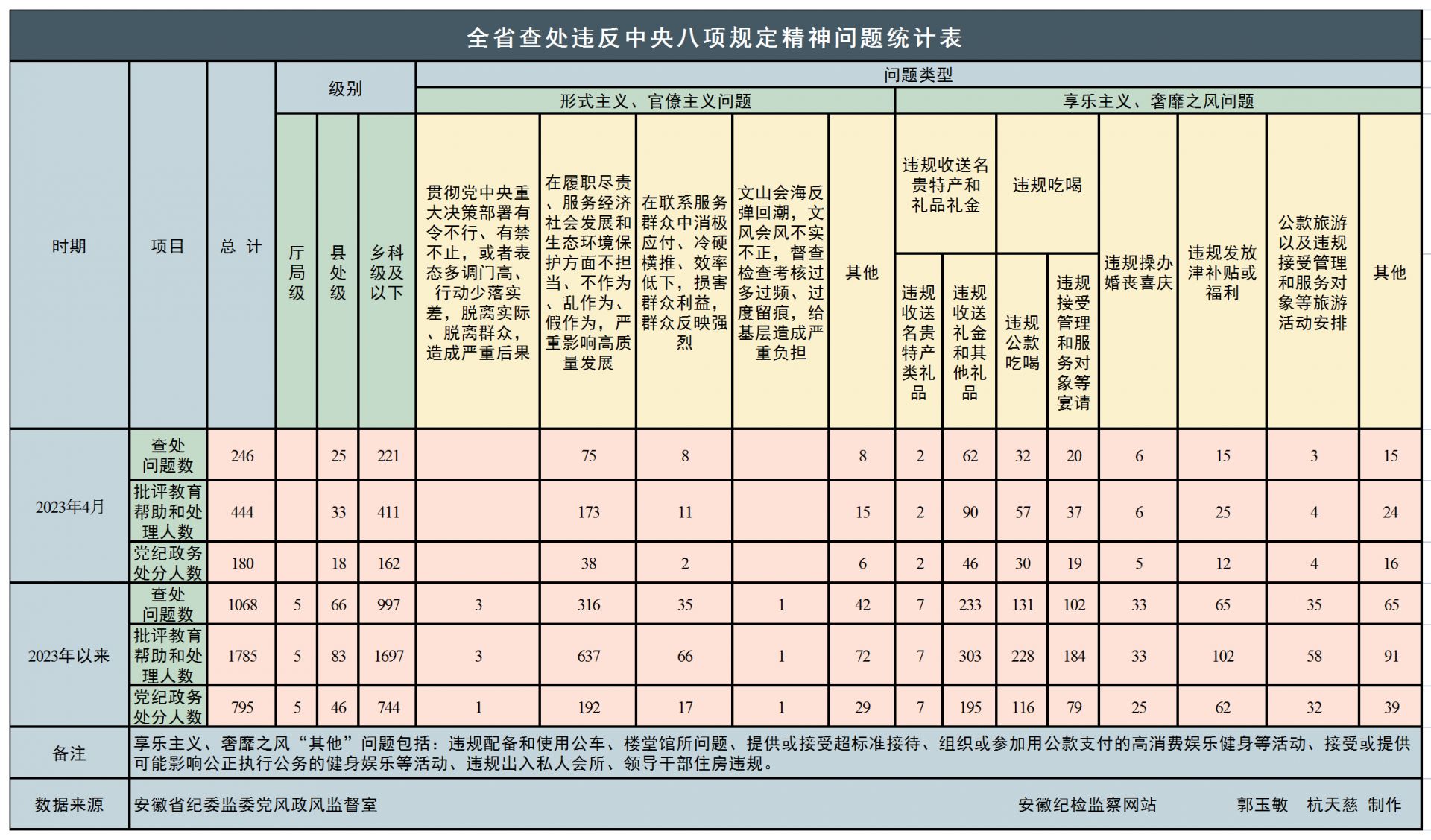 2023年4月,全省纪检监察机关共查处违反中央八项规定精神问题246起,批评教育帮助和处理444人,其中给予党纪政务处分180人,同比分别上升11.3%、29.8%、0.6%。
