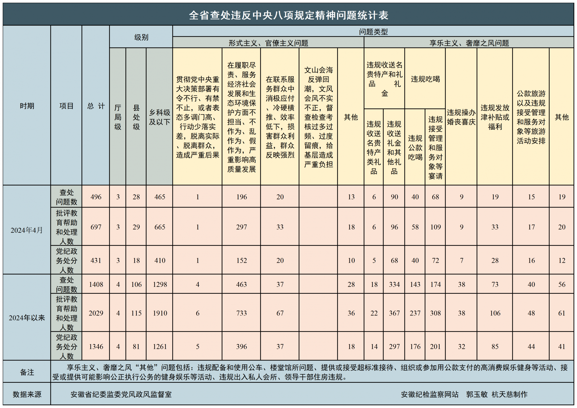 2024年4月,全省纪检监察机关共查处违反中央八项规定精神问题496起,批评教育帮助和处理697人,其中给予党纪政务处分431人。