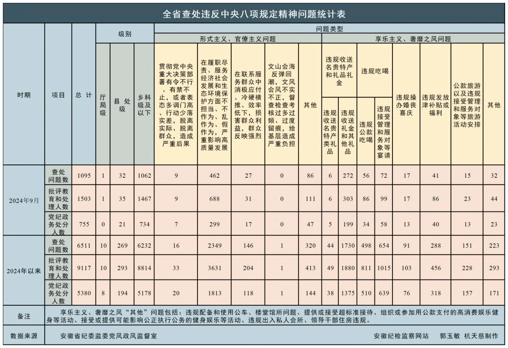 2024年9月,全省纪检监察机关共查处违反中央八项规定精神问题1095起,批评教育和处理1503人,其中给予党纪政务处分755人。